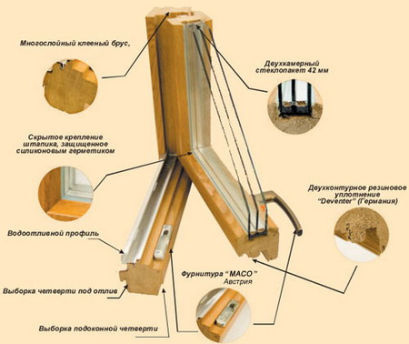 Окна изготавливаются из 3-х слойного клееного бруса ангарской сосны, сечением 80*68мм. Трехслойная структура, расположение слоев бруса перпендикулярно друг другу гарантируют идеальную геометрию в течение всего срока эксплуатации.